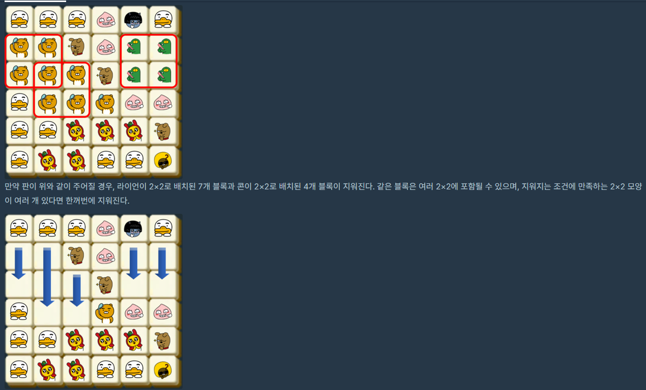1. 2X2칸의 이모티콘이 모두 같으면 해당 칸을 지운다.