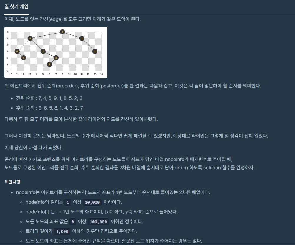 문제에 주어진 설명에서 간선, 전위 순회, 후위 순회를 보고서 트리 구조로 문제를 풀어야겠다는 생각이 들었다.