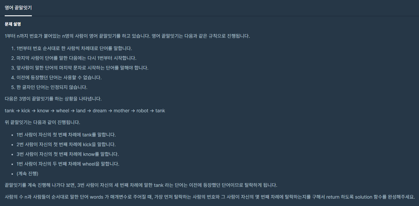 1번부터 N번까지 순서대로 영어로 끝말잇기를 한다.
