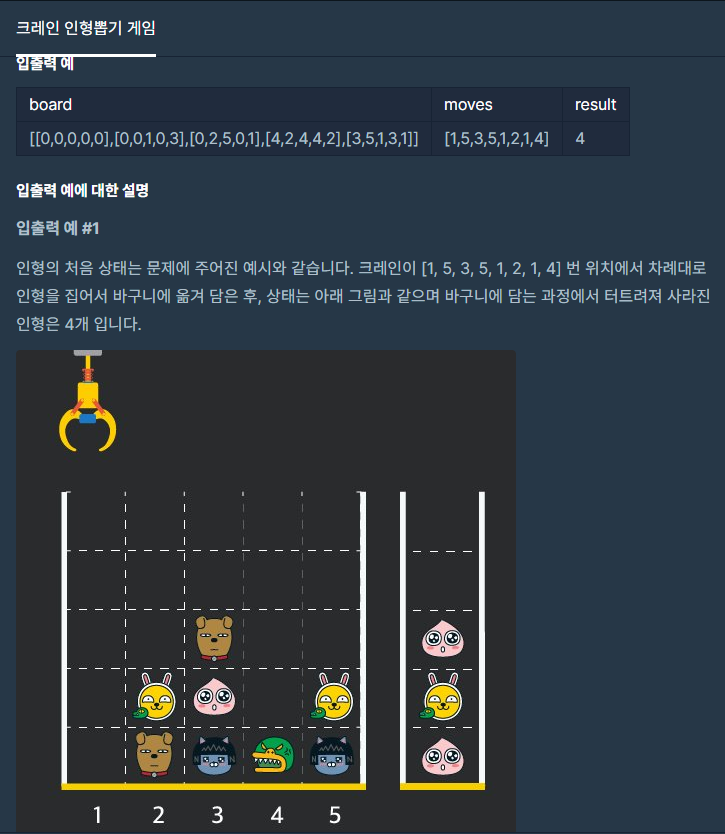 1. 크레인이 moves 배열의 위치로 가서 인형을 뽑는다 (이동 후 board [row][col]!= 0 인 위치 찾기)